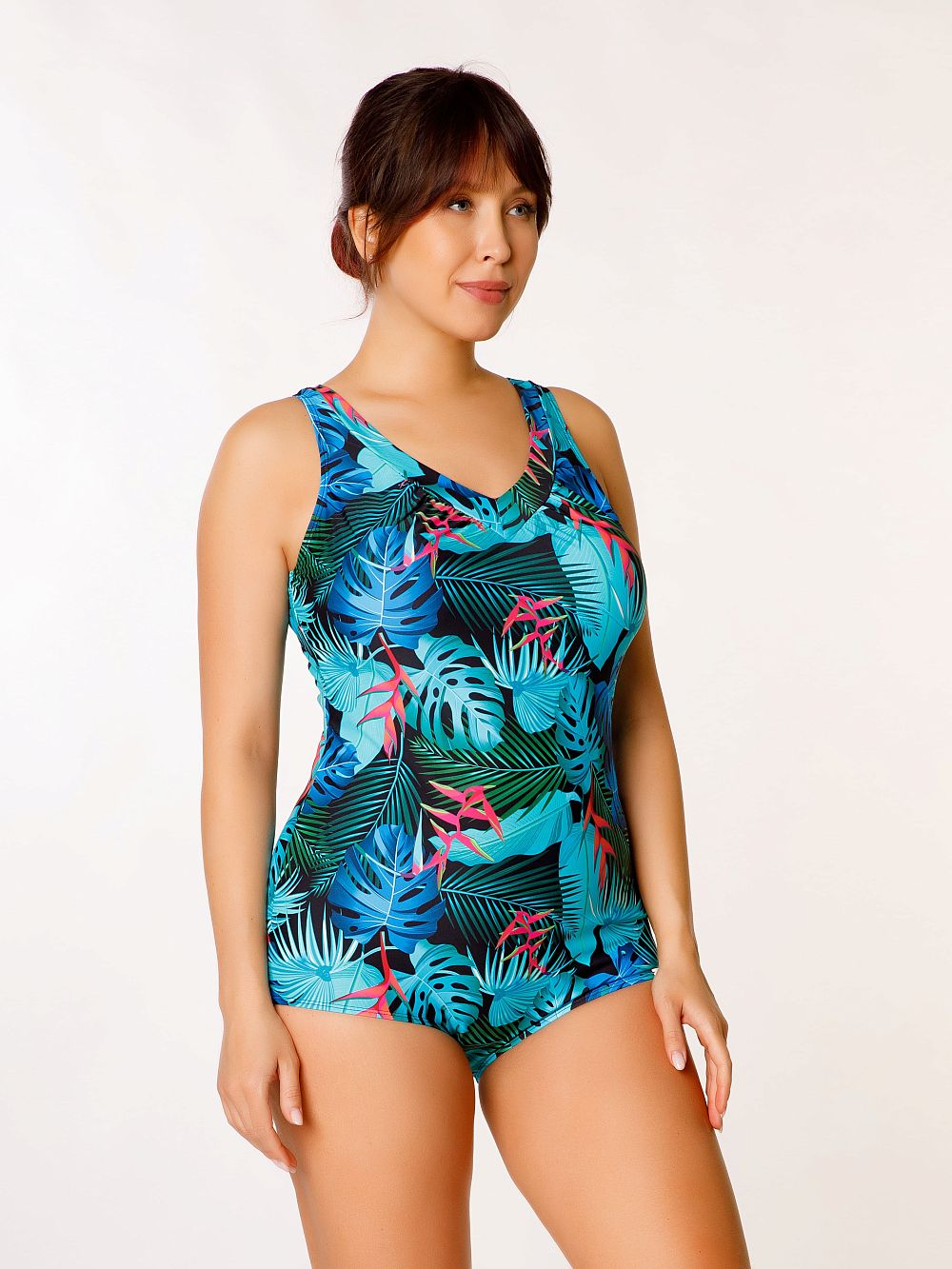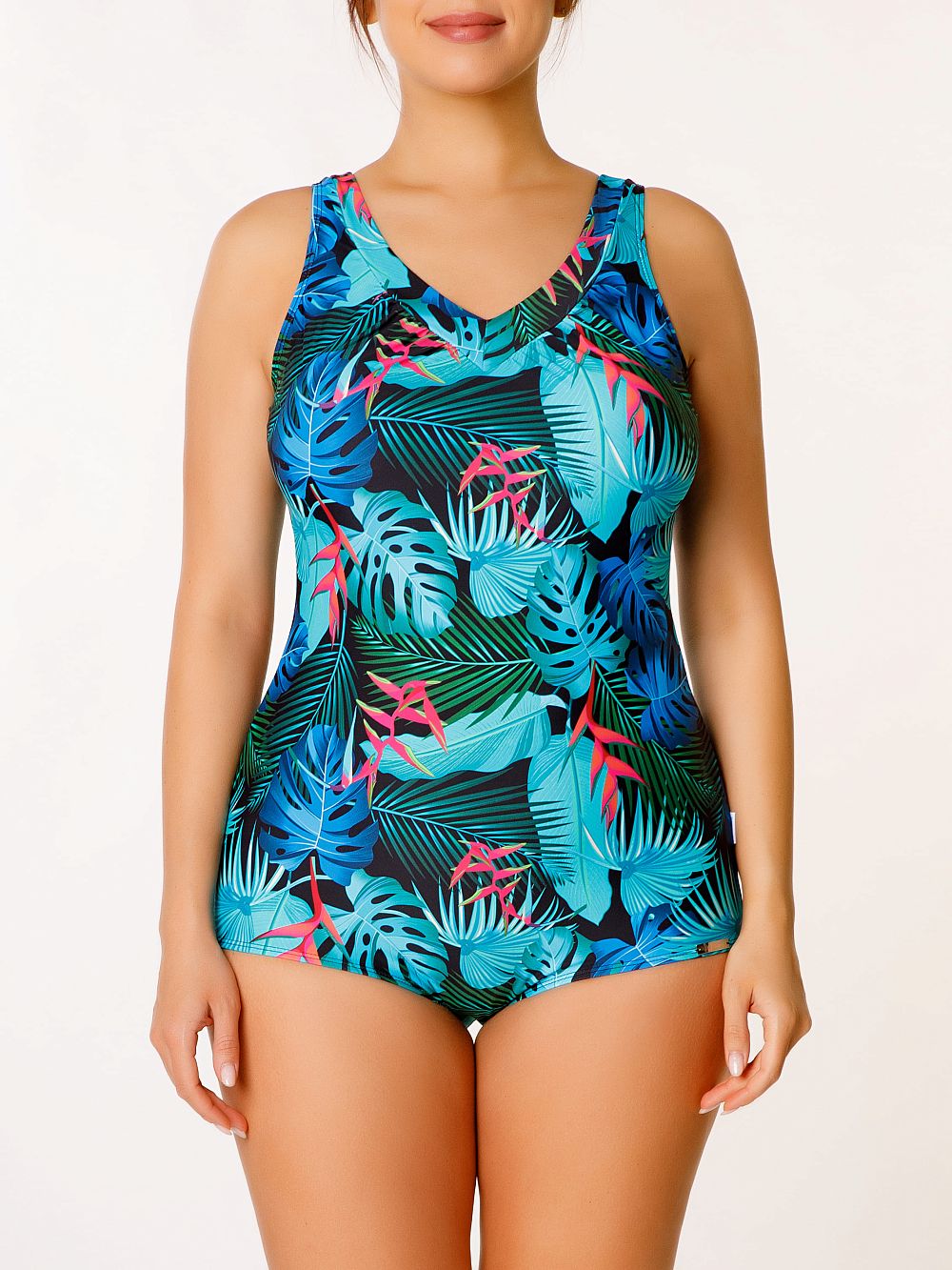За счет мягкости и эластичности материала купальник идеально садится по фигуре. Вырез бедра заниженный (полушорты). Купальник разработан специально для женщин с пышными формами.
