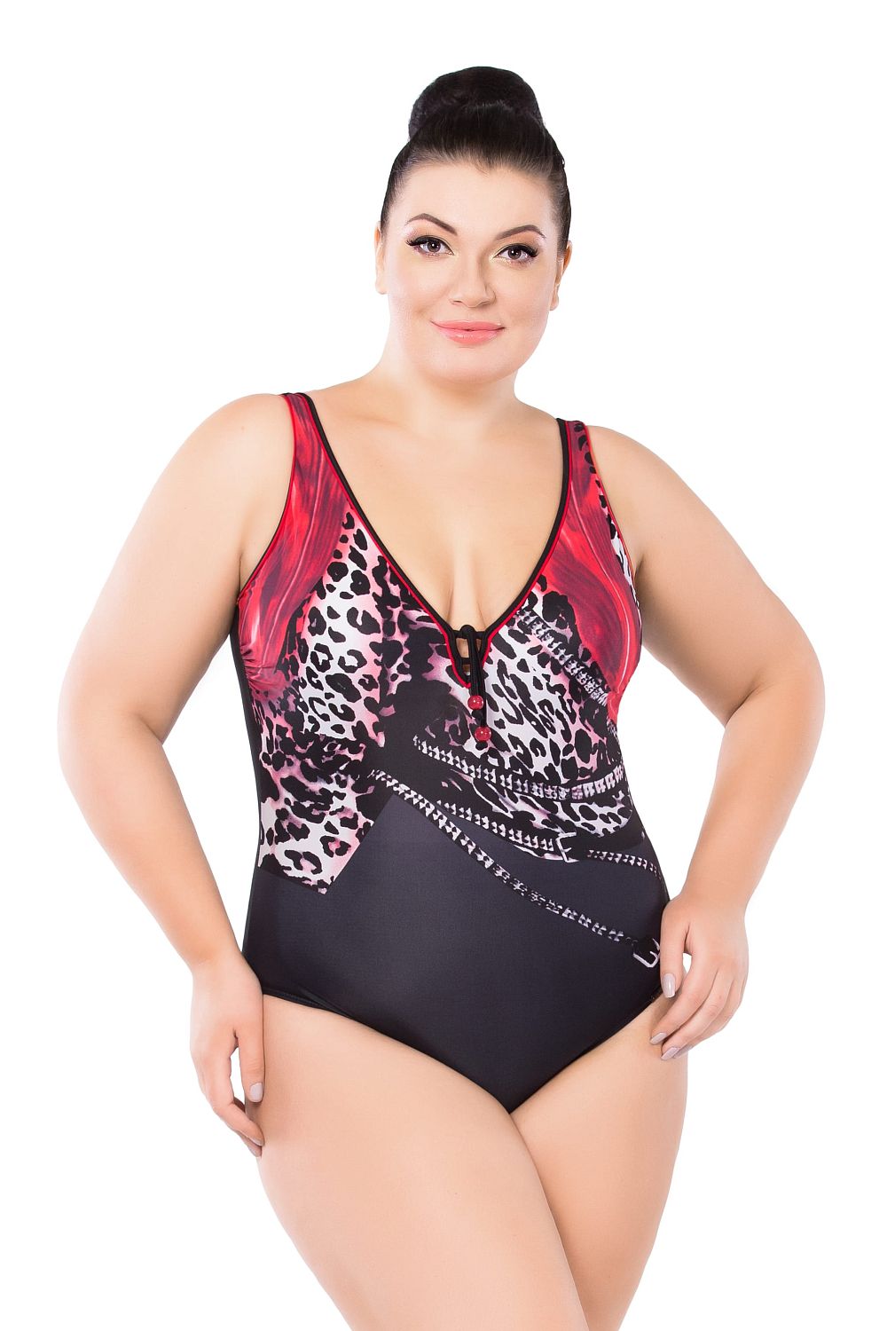 Неповторимый принт, оригинальное решение V – образного выреза и две бусины на груди, придают особую элегантность и шарм этому купальнику.