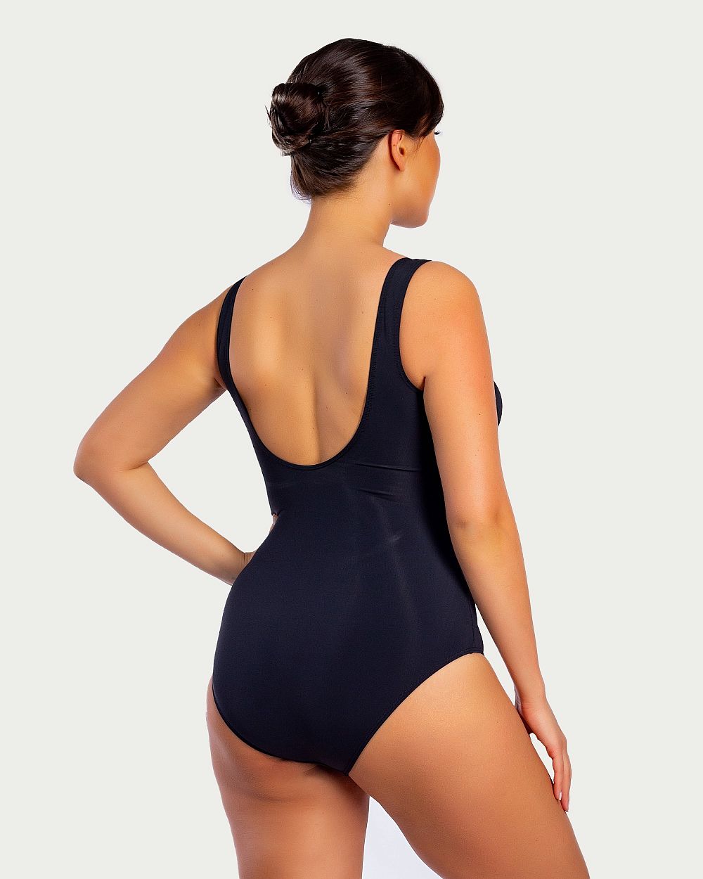 Лямки широкие и надежные, спинка классическая открытая, но вырез не очень глубокий, поэтому лямки купальника не спадут с плеч.