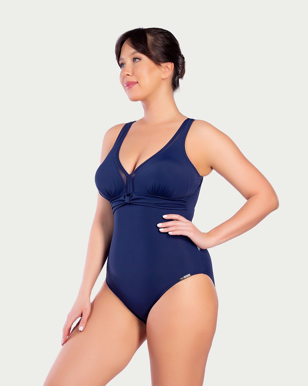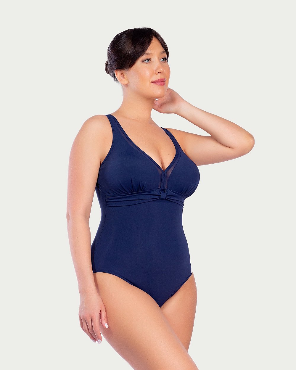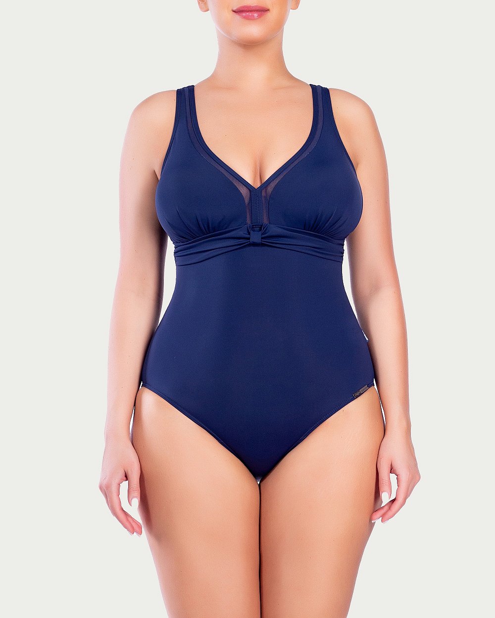 V – образный вырез удачно подчеркивает зону декольте. Вставки из сетки придают особую элегантность и шарм этому купальнику.